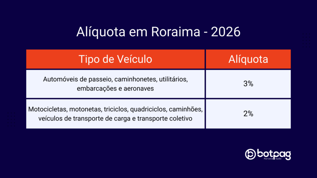O valor do IPVA é calculado com base no valor venal do veículo, determinado pela Tabela Fipe (Fundação Instituto de Pesquisas Econômicas), e multiplicado pela alíquota definida pelo estado. As alíquotas do IPVA 2026 em Roraima variam de acordo com o tipo de veículo.