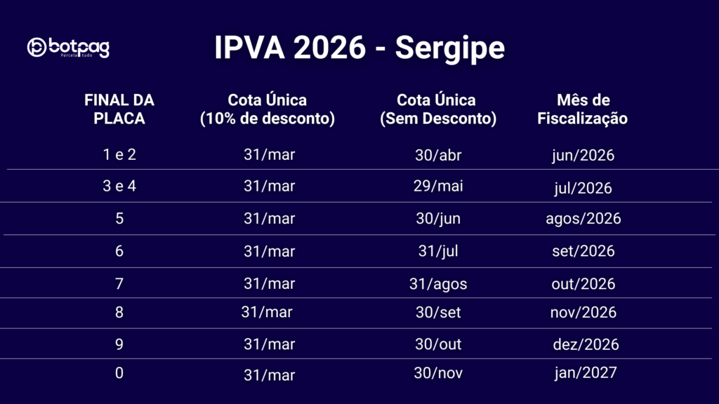 - Desconto de 10%: Para quem realizar o pagamento integral do IPVA 2026 Sergipe em cota única até o dia 31 de março de 2026.