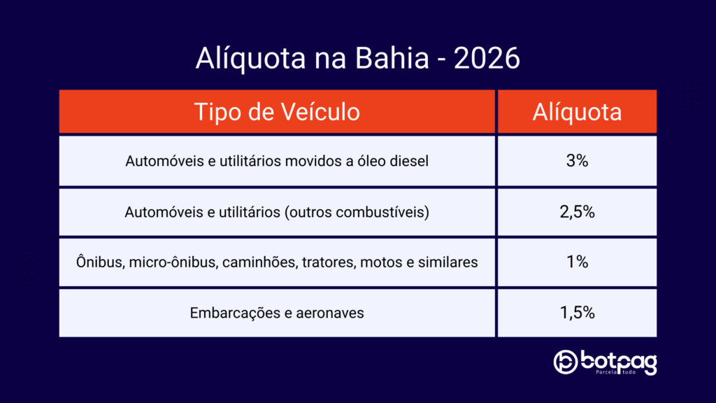 O valor do seu IPVA é calculado com base no valor venal do veículo (preço de mercado estabelecido pela Tabela FIPE) e na alíquota correspondente à categoria do seu veículo. Na Bahia, as alíquotas para 2026 permanecem as mesmas, como você pode ver na tabela abaixo: