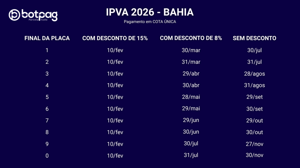 Confira abaixo a tabela completa com todas as datas de vencimento para o IPVA 2026 na Bahia, em cota única:
