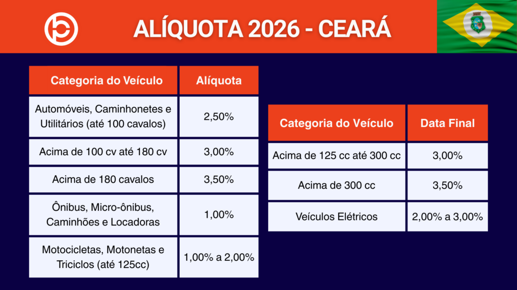Abaixo, detalhamos as principais alíquotas do IPVA 2026 Ceará para que você possa estimar o valor do seu imposto: