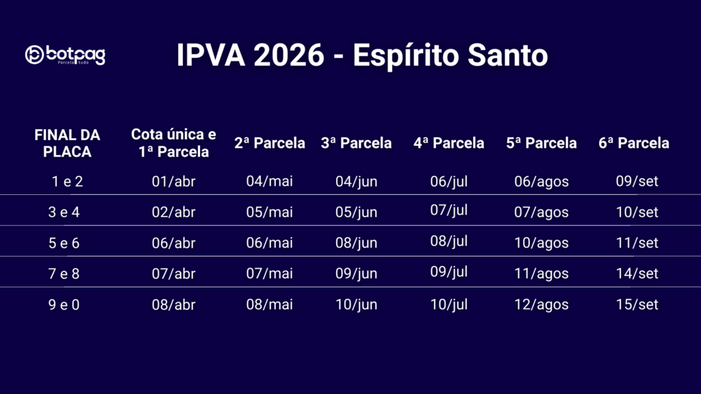 - Parcelamento em 6 Vezes: Por outro lado, se a opção for dividir o valor, o Espírito Santo permite o parcelamento em até seis cotas mensais e sucessivas, sem desconto. As parcelas vencem de abril a setembro de 2026.