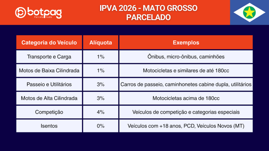 Veja abaixo a tabela de alíquotas do IPVA 2026 MT por categoria: