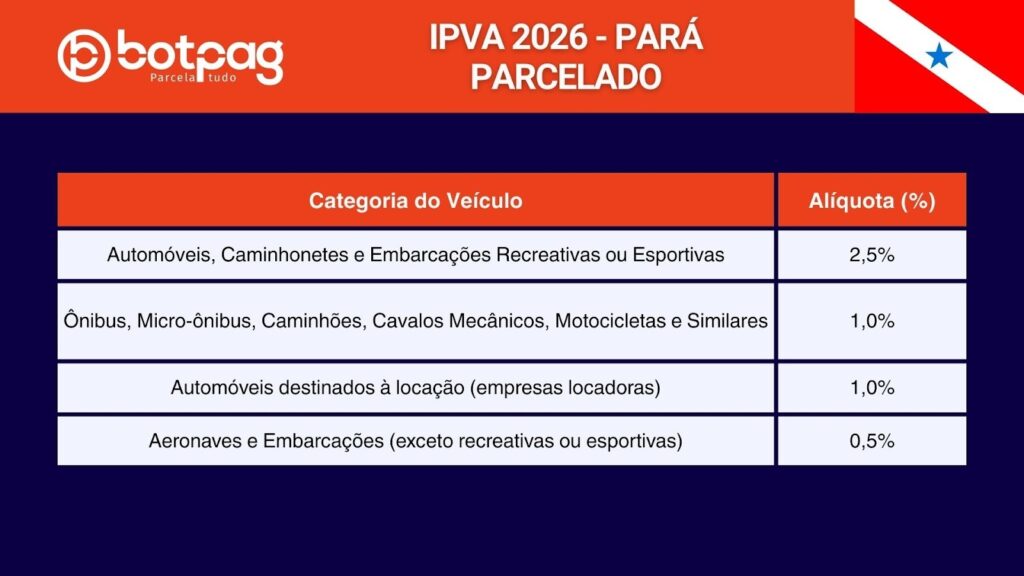 O valor do IPVA 2026 Pará é calculado aplicando-se a alíquota correspondente sobre o valor venal do veículo, que é determinado com base na tabela Fipe (Fundação Instituto de Pesquisas Econômicas). Portanto, a alíquota é um fator chave para saber quanto você irá pagar.
