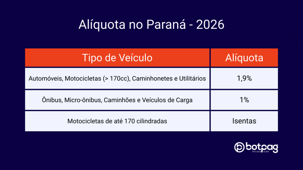 Para que você possa criar uma tabela clara no seu blog, confira abaixo as alíquotas vigentes para o IPVA 2026 no Paraná: