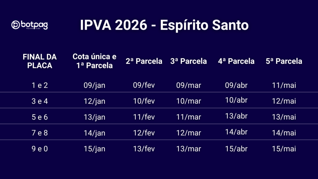 Outra opção é o parcelamento em até cinco cotas mensais e sucessivas, sem desconto. As parcelas vão de janeiro a maio de 2026. Para que você se organize, o vencimento da primeira parcela coincide com o vencimento da cota única.