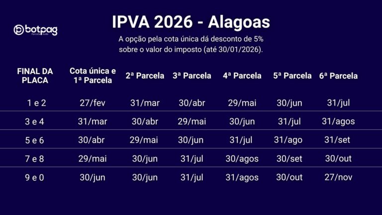 Você pode emitir as guias nos sites da Sefaz-AL e Detran-AL. Para facilitar, plataformas como a Botpag permitem a consulta e o pagamento de todos os débitos de forma centralizada, com a opção de parcelamento em até 12x no cartão.