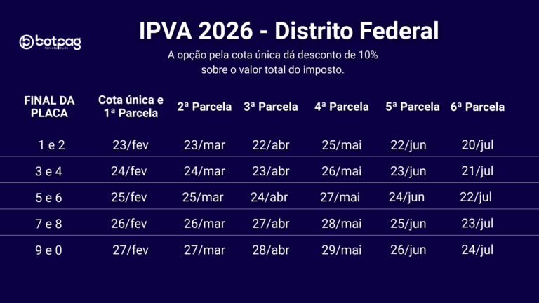 O pagamento do IPVA 2026 no Distrito Federal pode ser feito em cota única, com desconto, ou parcelado em até seis vezes, desde que o valor mínimo por parcela seja de R$ 50,00. Se o valor total do IPVA for inferior a R$ 100,00, o pagamento deverá ser feito em cota única.