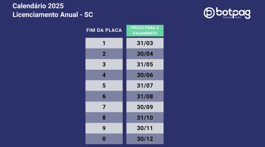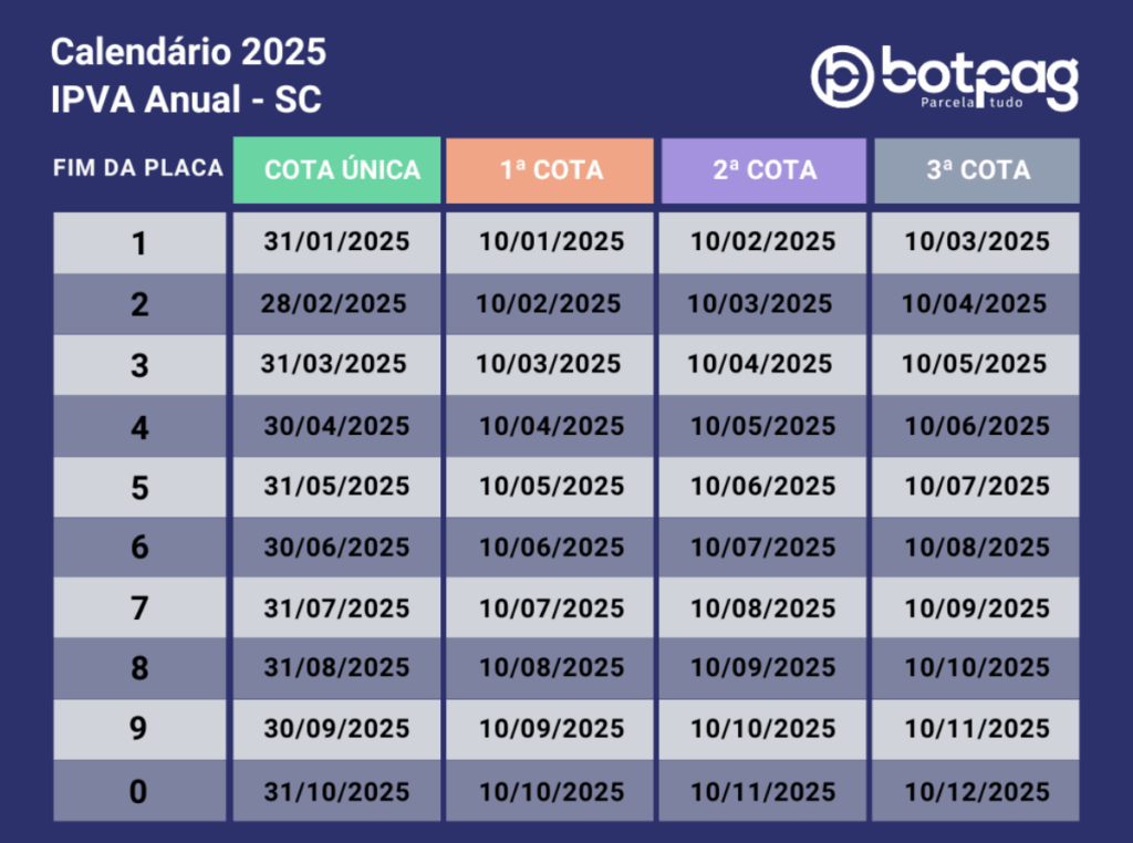 O calendário de pagamento do IPVA em Santa Catarina é escalonado de acordo com o final da placa do veículo. É crucial ficar atento às datas para evitar atrasos e penalidades. As opções de pagamento para 2025 são: